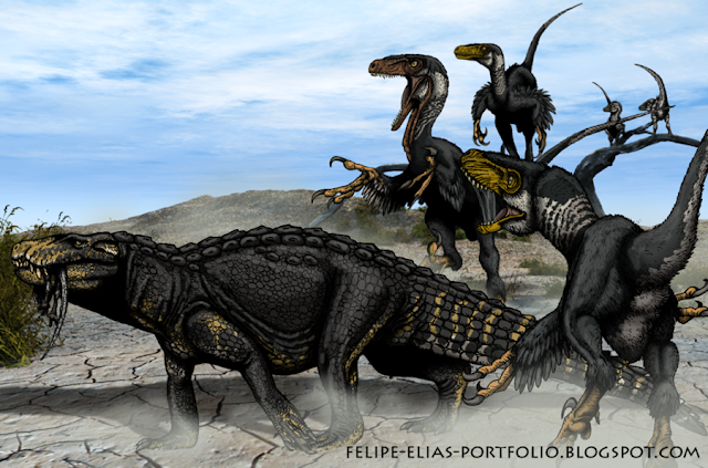 Un grupo de Dromaeosaurus trata de robarle el almuerzo a un Baurusuchus. Fuente: http://carnivoraforum.com/topic/9495678/1/ |